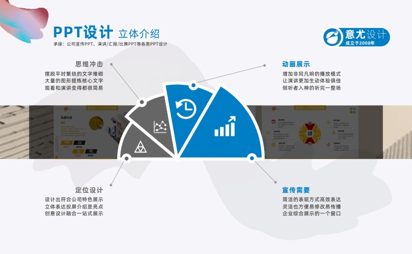 蘇州意尤文化傳播有限公司是一家有著多年廣告設計經驗的蘇州知名廣告企業(yè) 主要業(yè)務有蘇州PPT設計、蘇州產品PPT設計、蘇州企業(yè)PPT設計、蘇州會議PPT設計、蘇州項目PPT設計、企業(yè)VI設計、設計印刷宣傳冊/樣本/單頁/名片等 自2007年成立以來,蘇州意尤廣告公司與蘇州及蘇州各市的幾百家中外企業(yè)進行了廣告設計合作,經過多年發(fā)展公司已形成了以企業(yè)PPT設計、企業(yè)VI設計,廣告設計,廣告印刷,樣本設計,宣傳冊設計,名片印刷,菜譜制作,單頁,宣傳單等一批特長業(yè)務,相信在各位新老客戶的關心下,本公司會得到更大的發(fā)展,同時為客戶的發(fā)展宣傳保駕護航。
